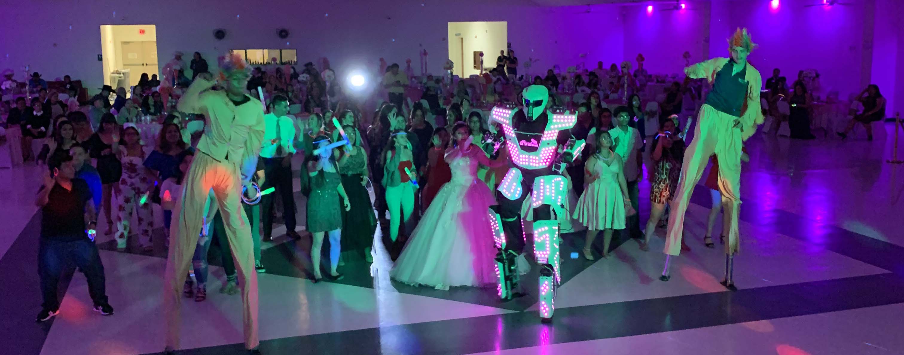 Add excitement and pizazz to any event with the Valley Famous LED Robots and Harlequines. As soon as these guys get going, see your event light up and everyone get on the dancefloor to dance all the greatest line dances that everyone loves to dance to. See all chidren and adults dance together for an hour and at the end, take great group photos with this package of fun!